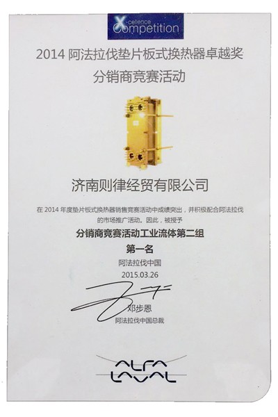 定制产品类型:阿法拉伐板式换热器分销商竞赛荣誉证书